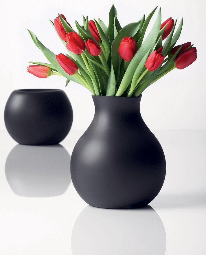 Single blooms, huge displays or even reeds and grasses, they add the elegance and color that Mother Nature provides every day – all they needs are beautiful containers. We especially like the handmade vases that are created from recycled wine bottles and the cheerfully bulbous rubber vase – seen in black below but available in other colors.